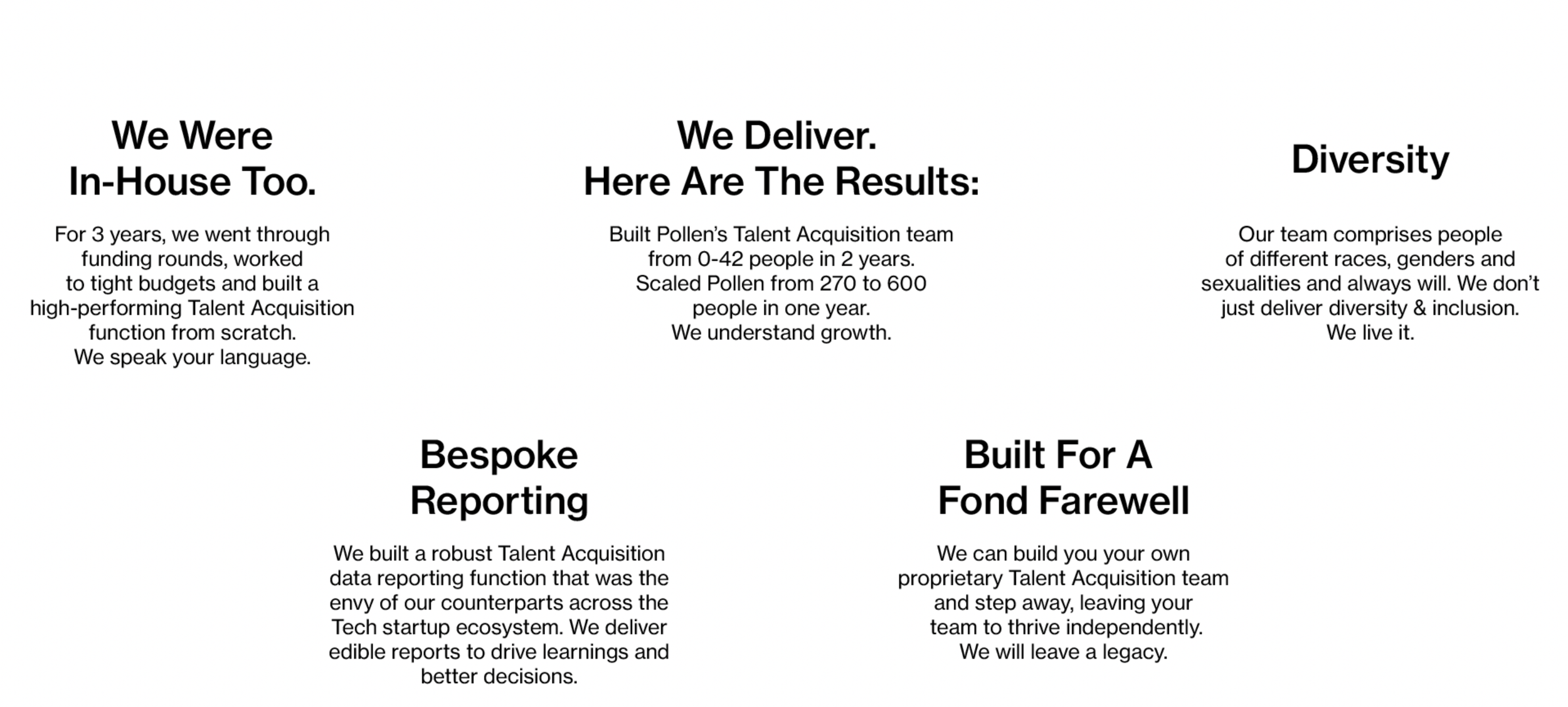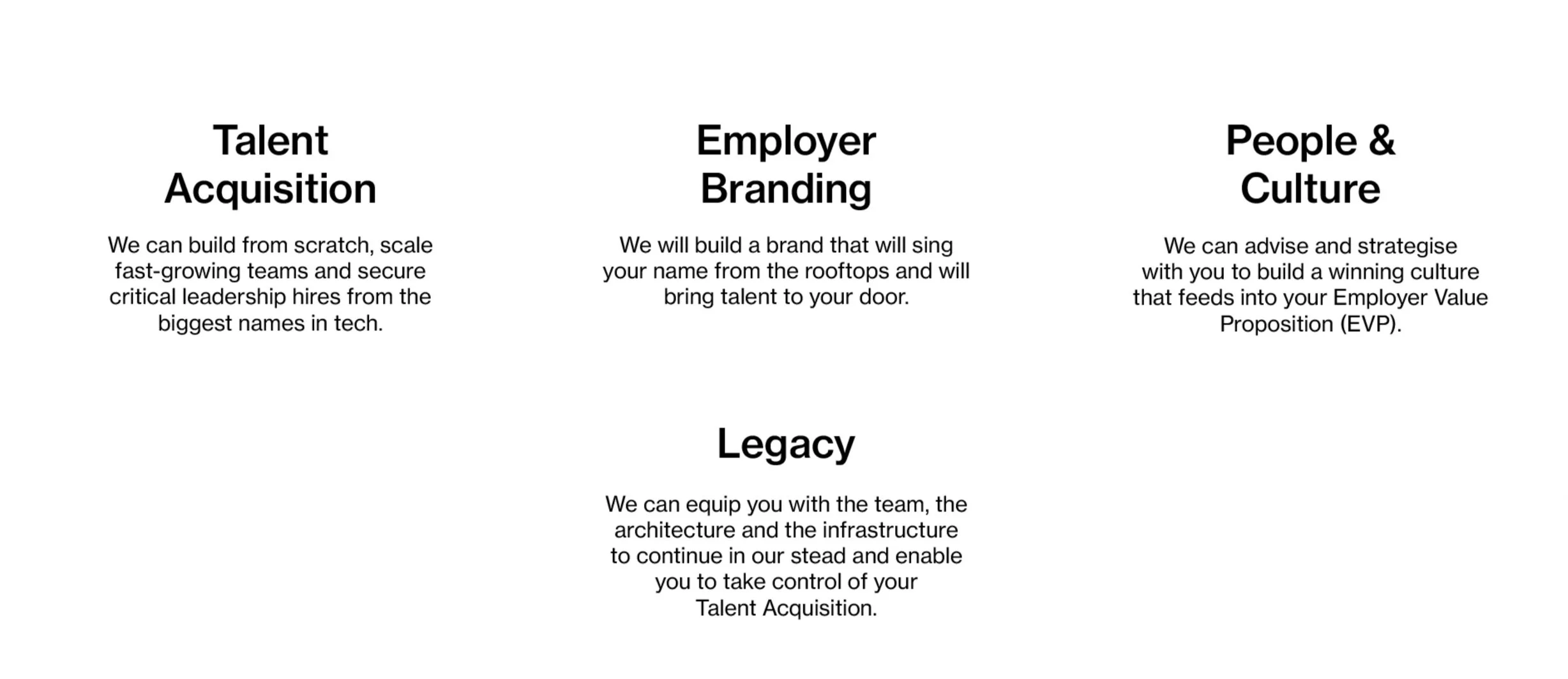 Integrate our world class Talent Acquisition teams into your company and culture. With expertise in scaling Talent Acquisition teams from scratch and scaling fast-growing teams, we have proven pedigree in guiding companies through Series A-C growth. We have experience building some truly exciting and disruptive teams, secring talent from the likes of Netflix, Deliveroo, Spotify & Instagram, to name a few.